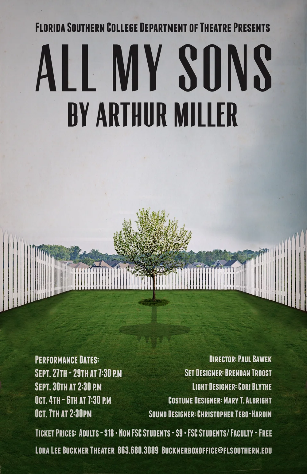 The design for Florida Southern College's production of Arthur Miller's 'All My Sons' encapsulates key themes from the play. Drawing inspiration from the poignant backdrop of an Ohio suburb, an reoccurring apple tree, and the haunting shadow of a bygone war that lingers over the family, the poster is meant to capture the essence of the production with striking imagery.